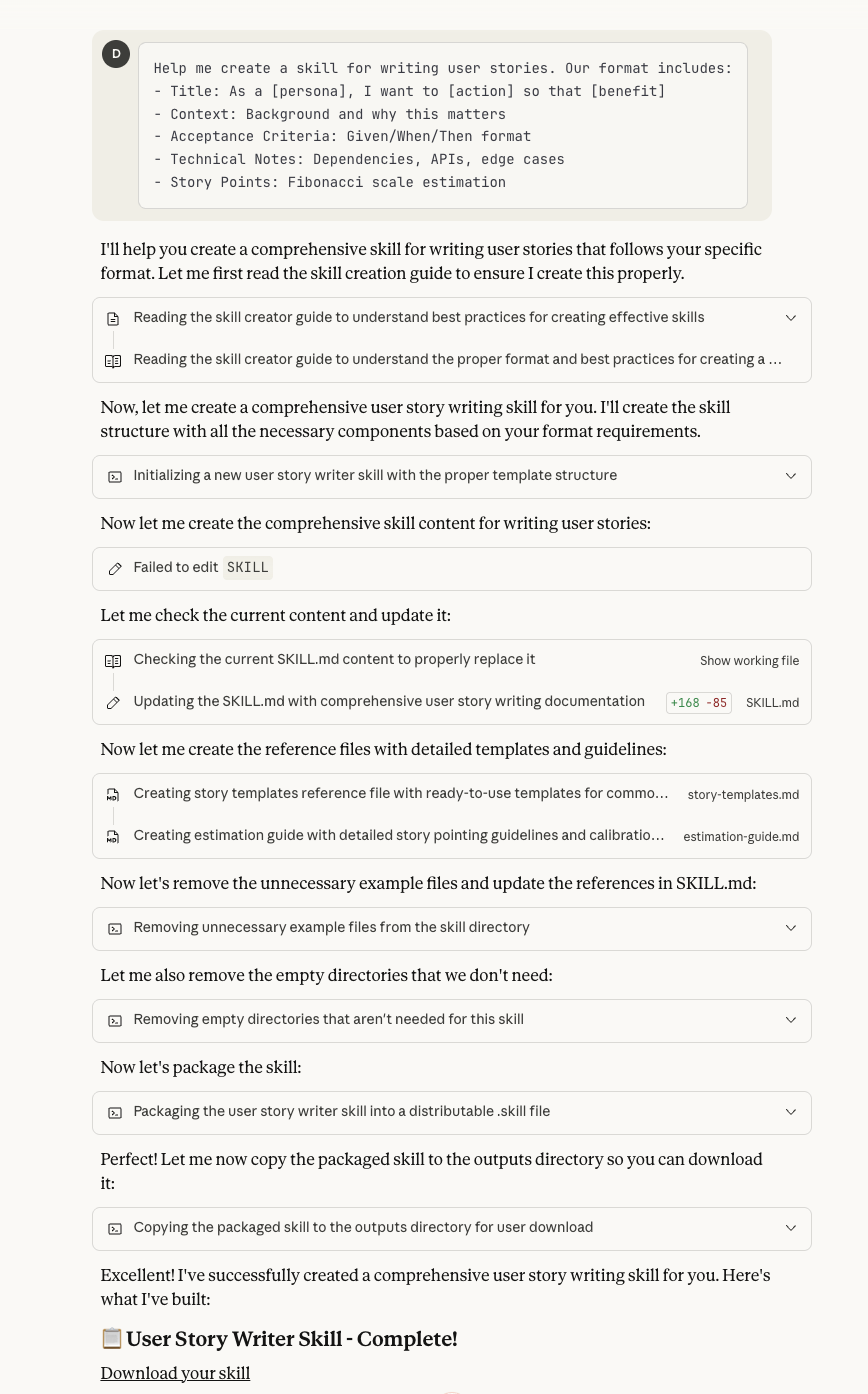 - Story Points: Fibonacci scale estimationClaude starts working, and does tons of things under the hood to create a skill as you can see in the screenshot below. But the best thing is - you don’t need to do much to create your first skill.