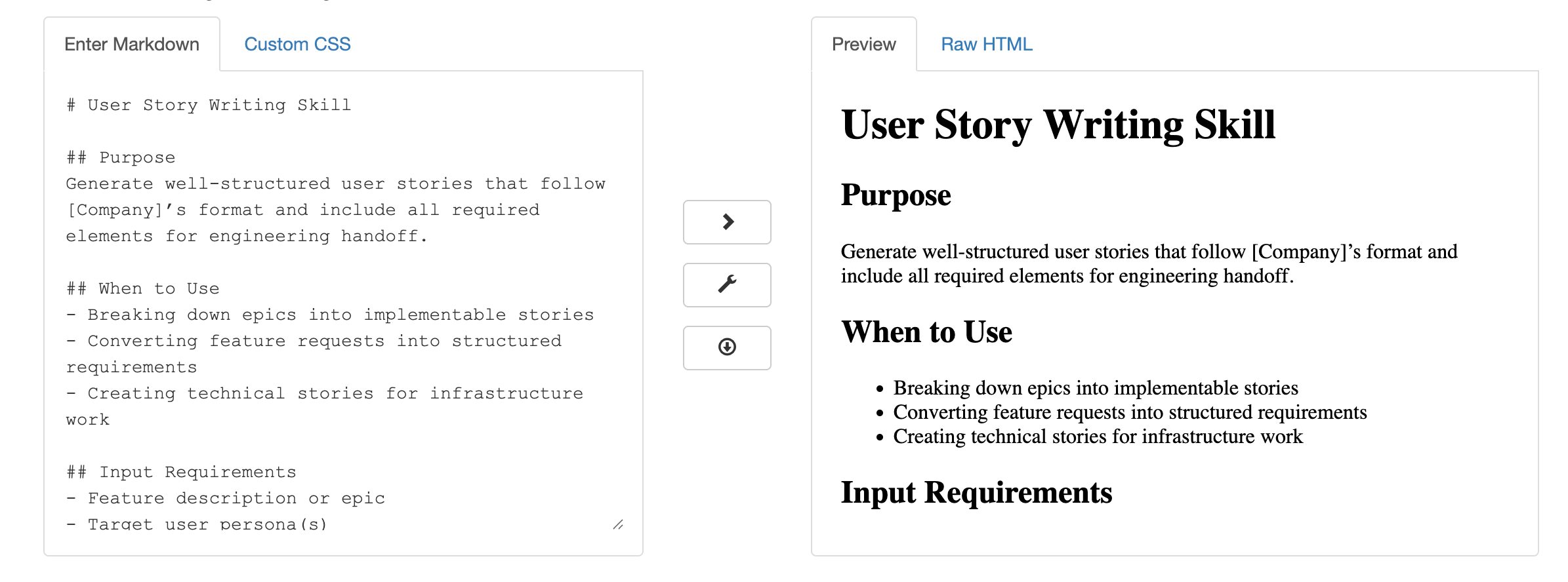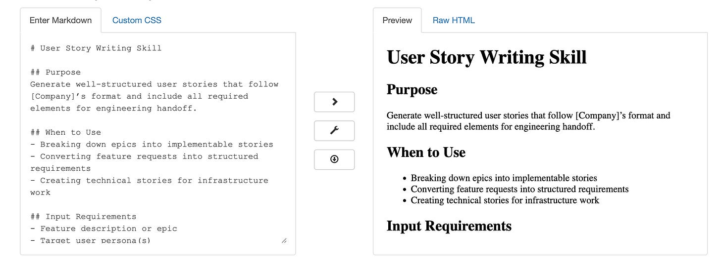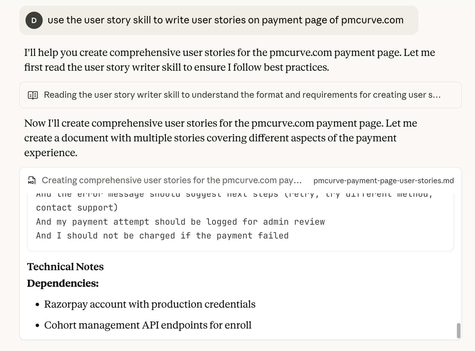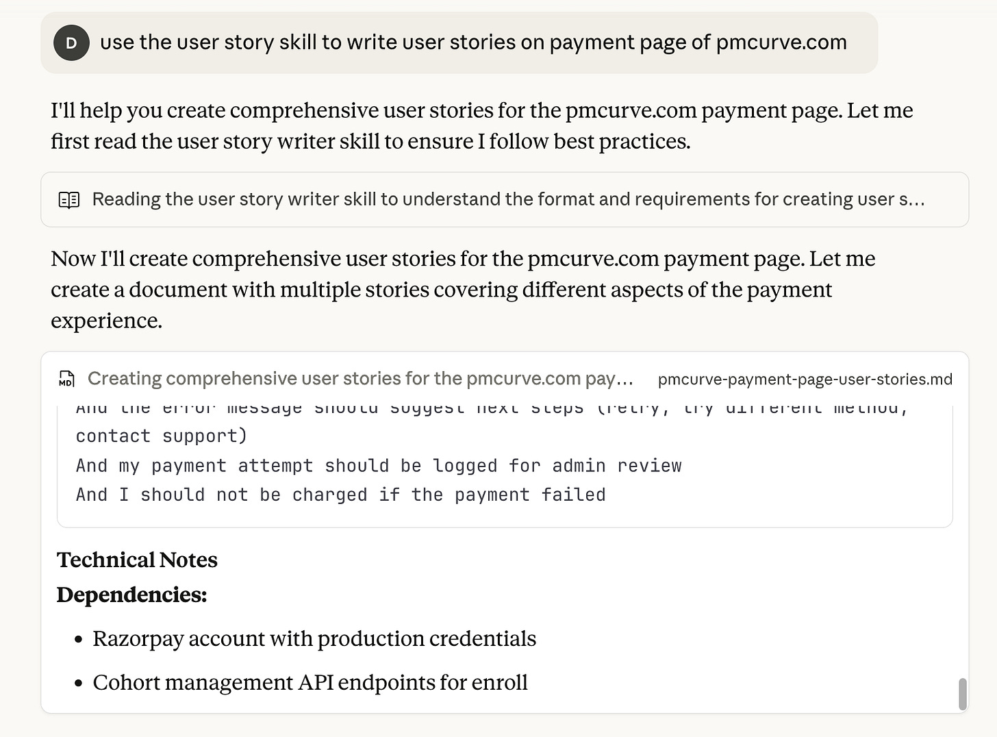 Here is an example of a skill useful for product managers — writing user stories. As you can see, the skill has